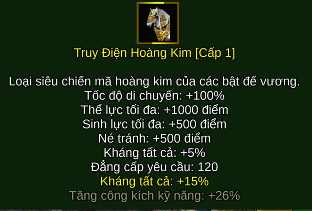 Truy Điện - Hoàng Kim (Cấp 1) Kháng tất cả: 15% Công kích kỹ năng ngẫu nhiên: 1% - 64% |