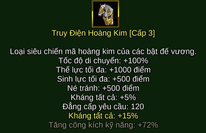 Truy Điện - Hoàng Kim (Cấp 3) Kháng tất cả: 15% Công kích kỹ năng ngẫu nhiên: 1% - 72% |