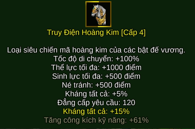 Truy Điện - Hoàng Kim (Cấp 4) Kháng tất cả: 15% Công kích kỹ năng ngẫu nhiên: 1% - 76% |