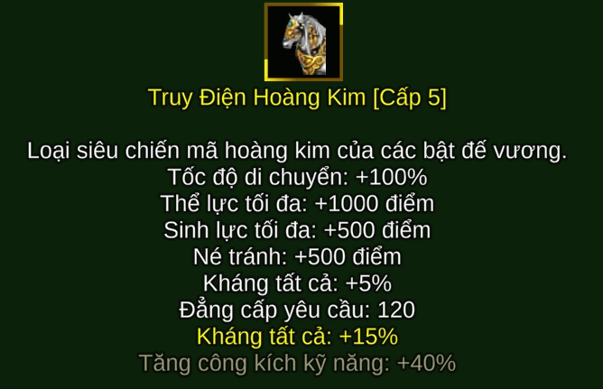 Truy Điện - Hoàng Kim (Cấp 5) Kháng tất cả: 15% Công kích kỹ năng ngẫu nhiên: 1% - 80% |
